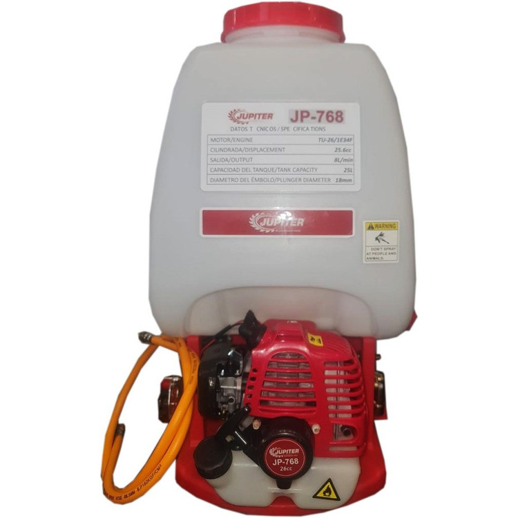 سمپاش پشتی موتوری لانسی ژوپیتر مدل JP768 با مخزن 25 لیتری مقاوم و همچنین لانس و موتور با کیفیت پاسخگوی بسیاری از امور سم پاشی میباشد، حمل و نقل آسان و استارت سریع و ارام، مخزن پلی اتیلن که در برابرسموم شیمیایی و نور آفتاب مقاوم میباشد. نازل سوزنی و افشانی با قابلیت تنظیم میزان پاشش محلول که موجب ارتقاء کیفیت و گستردگی سطح پوشش سم پاشی و ضریب نشست یکنواخت سم برروی گیاه و صرفه جویی در مصرف سم میشود، این سمپاش ساخت کشور چین و نوع سوخت آن بنزینی می باشد. حداکثر ارتفاع پاشش این مدل سمپاش موتوری 7 متر میباشد.موتور این دستگاه 2 زمانه میباشد و روغن و بنزین در یک باک ریخته میشود